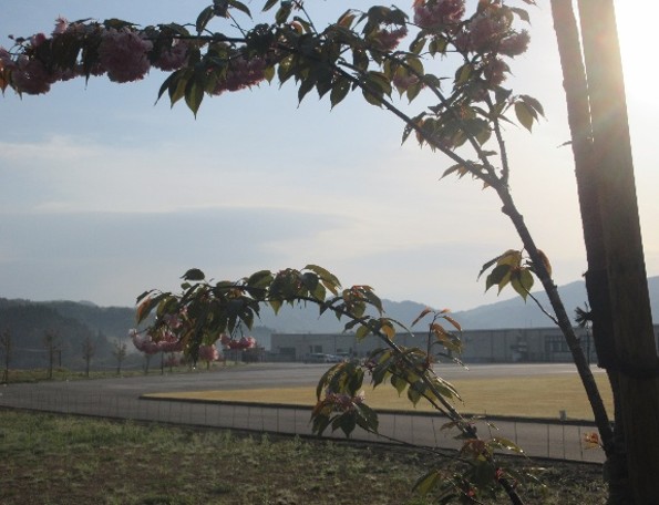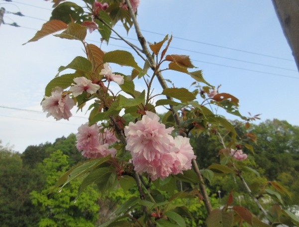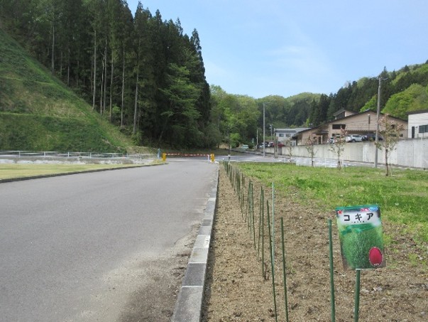 八重桜が咲いている花壇にはコキアの芽も出始めました。